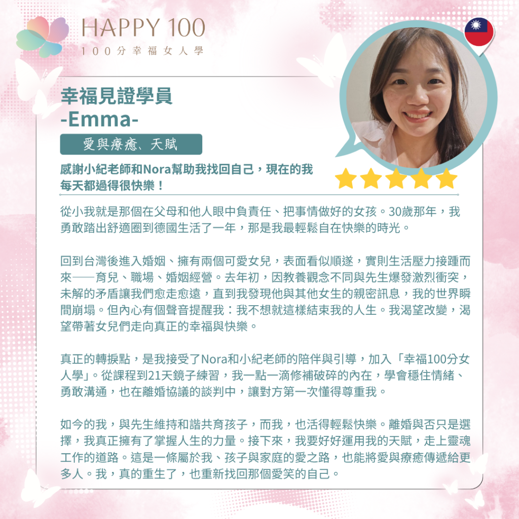 真正的轉捩點,是她加入《100分幸福女人學》後開始的旅程。在Nora與小紀老師的陪伴引導下,Emma透過課程與21天鏡子練習,一點一滴修補破碎的內在,學會穩定情緒、勇敢溝通,也在離婚協議的談判中,讓丈夫第一次學會尊重她。